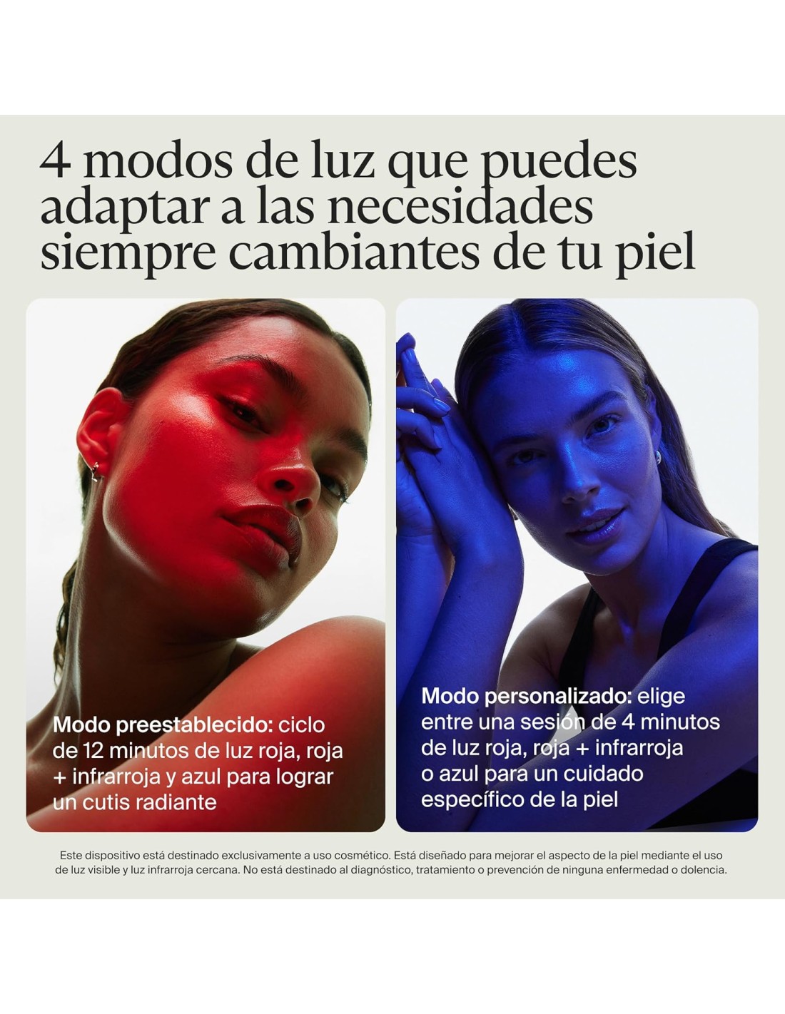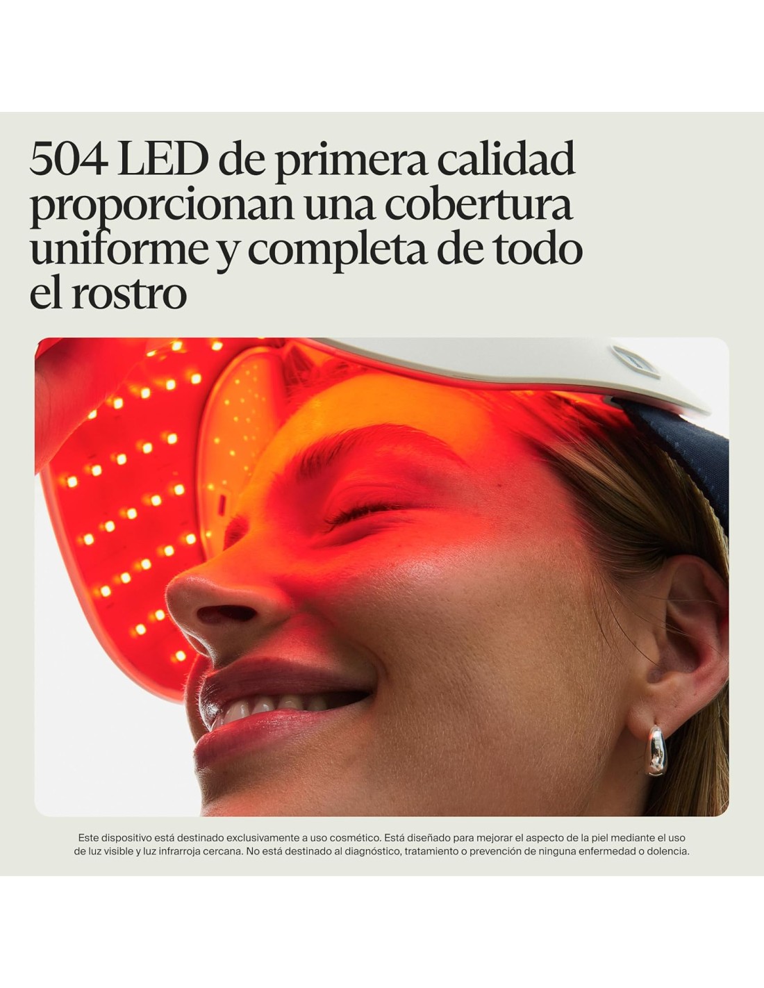 MÁSCARA FACIAL DE COBERTURA COMPLETA: 504 LED que proporcionan una cobertura facial uniforme y completa. Recorre la rutina preestablecida de 12 minutos o elige sesiones individuales de 4 minutos de luz roja, roja + infrarroja o azul para obtener resultados personalizados.