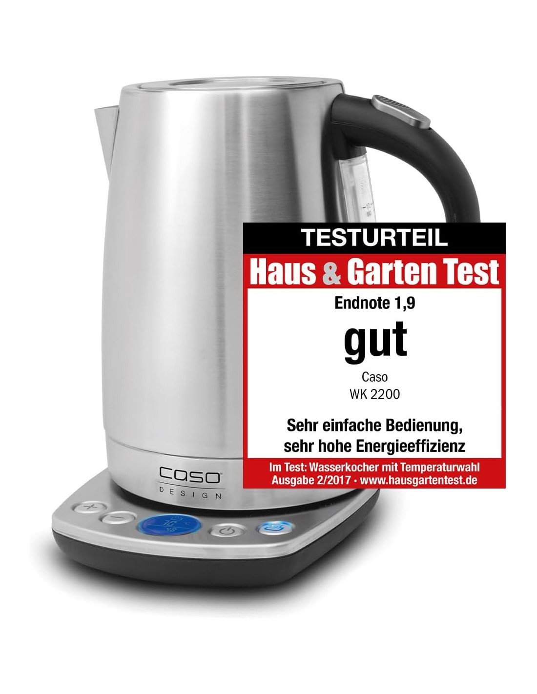 B010TLUIC4 _Caso WK 2200 - Tetera eléctrica (1,7 L, 2200 W, Negro, Acero inoxidable, Acero inoxidable, Indicador de nivel de agua, Función mantener caliente).