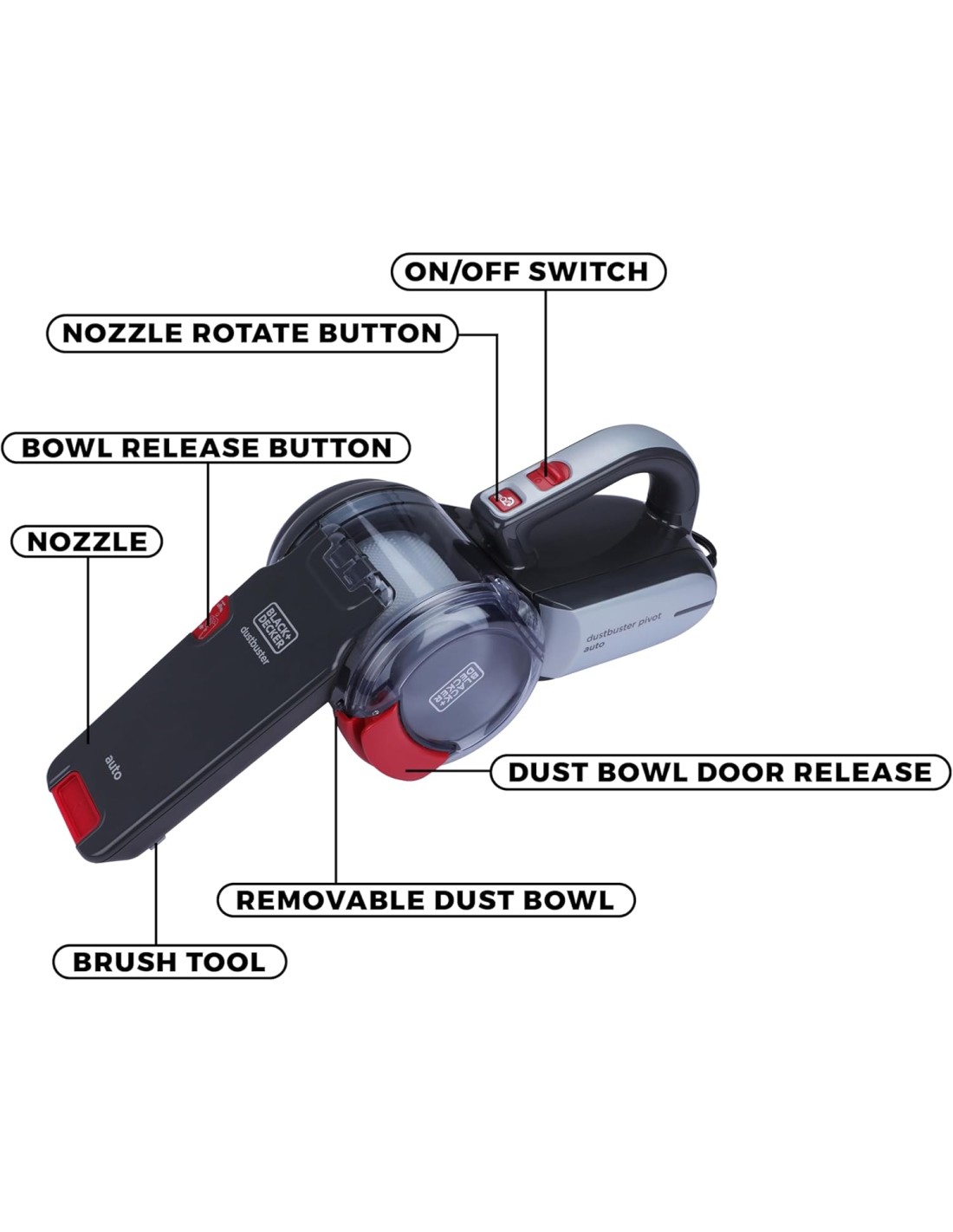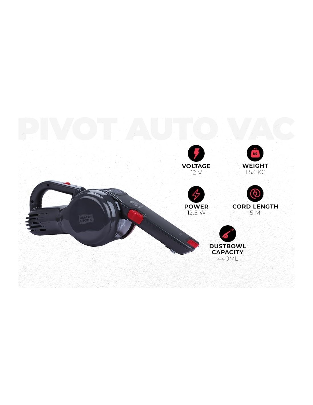 Black+Decker PV1200AV-XJ - Aspirador de Coche con Cabezal Pivotante 12 V, 350 ml, Adaptador para Mechero, Gris/ Rojo/ Transparen