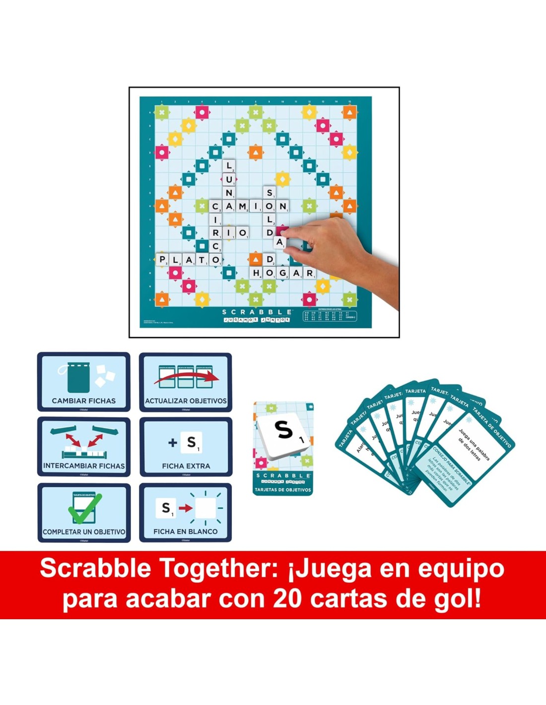 En Scrabble Together, trabaja en equipo para completar un surtido de 50 tarjetas de objetivos que ayudan a enseñar los conceptos básicos del Scrabble.